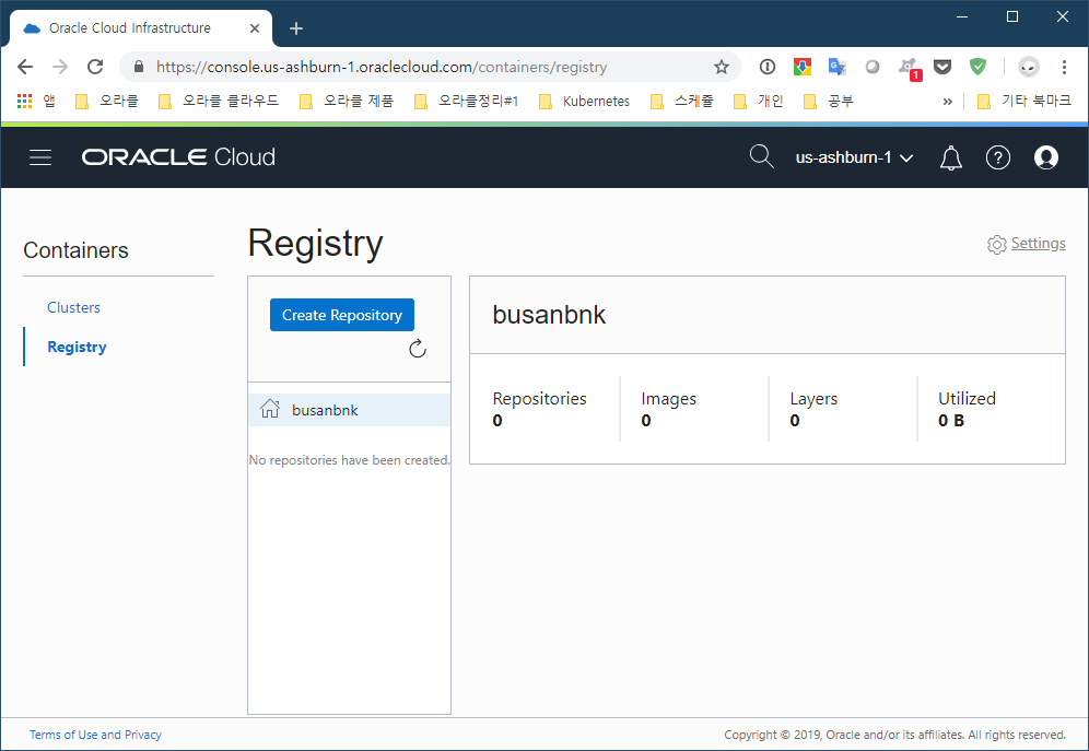 다음 화면은 오라클 OCI에서 제공하는 비공개 도커 레지스트리 화면입니다.