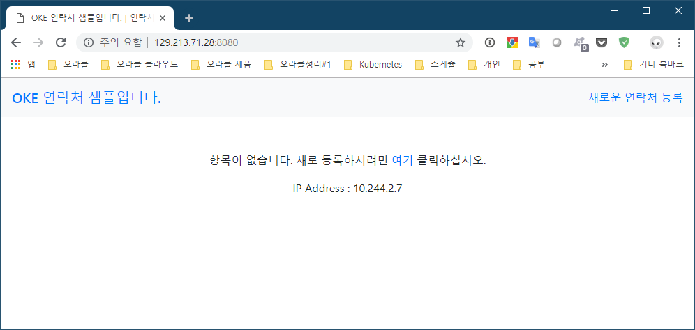 $ kubectl get services NAME TYPE CLUSTER-IP EXTERNAL-IP PORT(S) AGE kubernetes ClusterIP 10.96.0.1 <none> 443/TCP 2d mysql ClusterIP 10.96.107.120 <none> 3306/TCP 39m oke-sample LoadBalancer 10.96.41.195 129.213.71.28 8080:32517/TCP 30m로드밸런서의 외부IP인 http://129.213.71.28:8080 로 접속을 여러번 해 보면, 애플리케이션에서 나타내는 로컬 IP가 3개의 서버 IP를 랜덤으로 나타납니다.